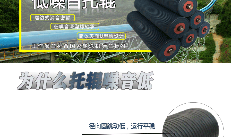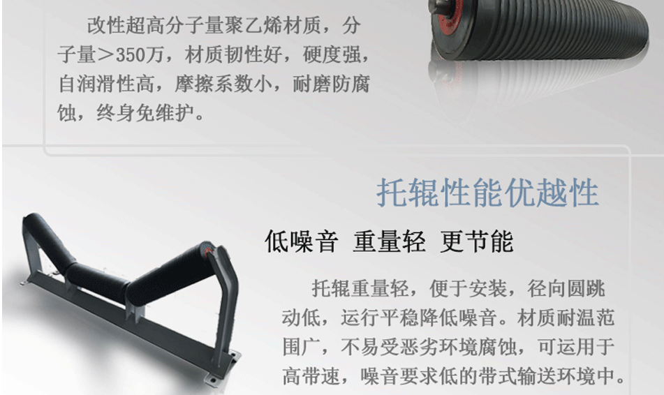 產(chǎn)品簡(jiǎn)介: FJS-JY低噪音托輥,其管體選用優(yōu)質(zhì)改性超高分子量聚乙烯(UHMW-PE)主材料,通過(guò)良好的生產(chǎn)加工工藝,使動(dòng)平衡等級(jí)達(dá)到G16(ISO1940)標(biāo)準(zhǔn),運(yùn)行平穩(wěn),U型通風(fēng)槽精細(xì)加工,減少與皮帶的摩擦。結(jié)合華北塑料公司自主研發(fā)的唇邊式消音密封,使帶式輸送機(jī)的噪音降到(達(dá)到)國(guó)家標(biāo)準(zhǔn)GB12348以下。
